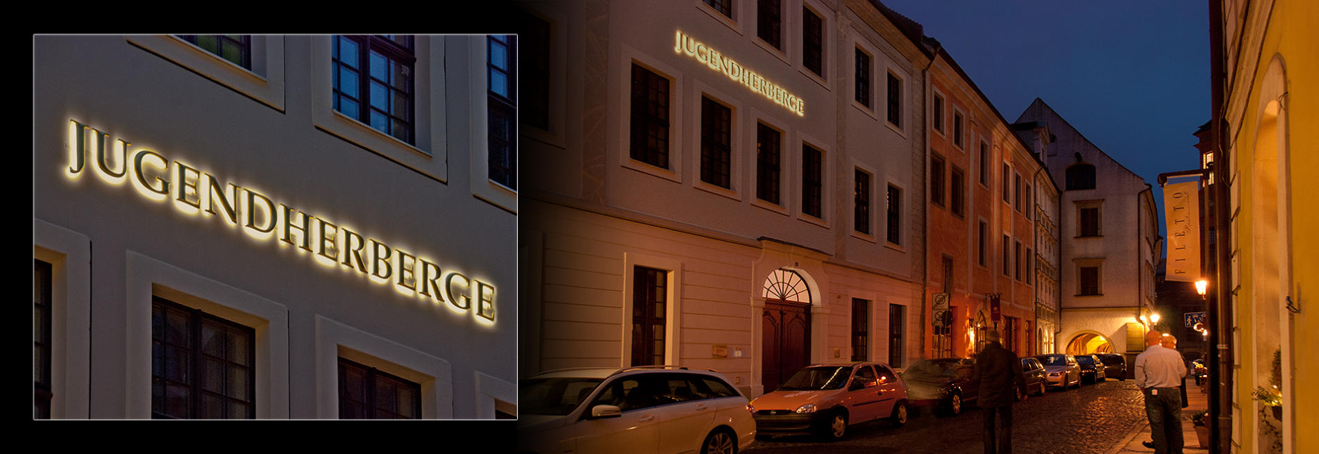 Ein ganz besonderer Effekt stellt sich zur Dämmerungszeit ein und setzt sich auch in die Dunkelheit hinein fort. Dann nämlich hinterleuchten Hunderte von kleinen Hochvolt-LEDs die Schrift und sorgen für eine